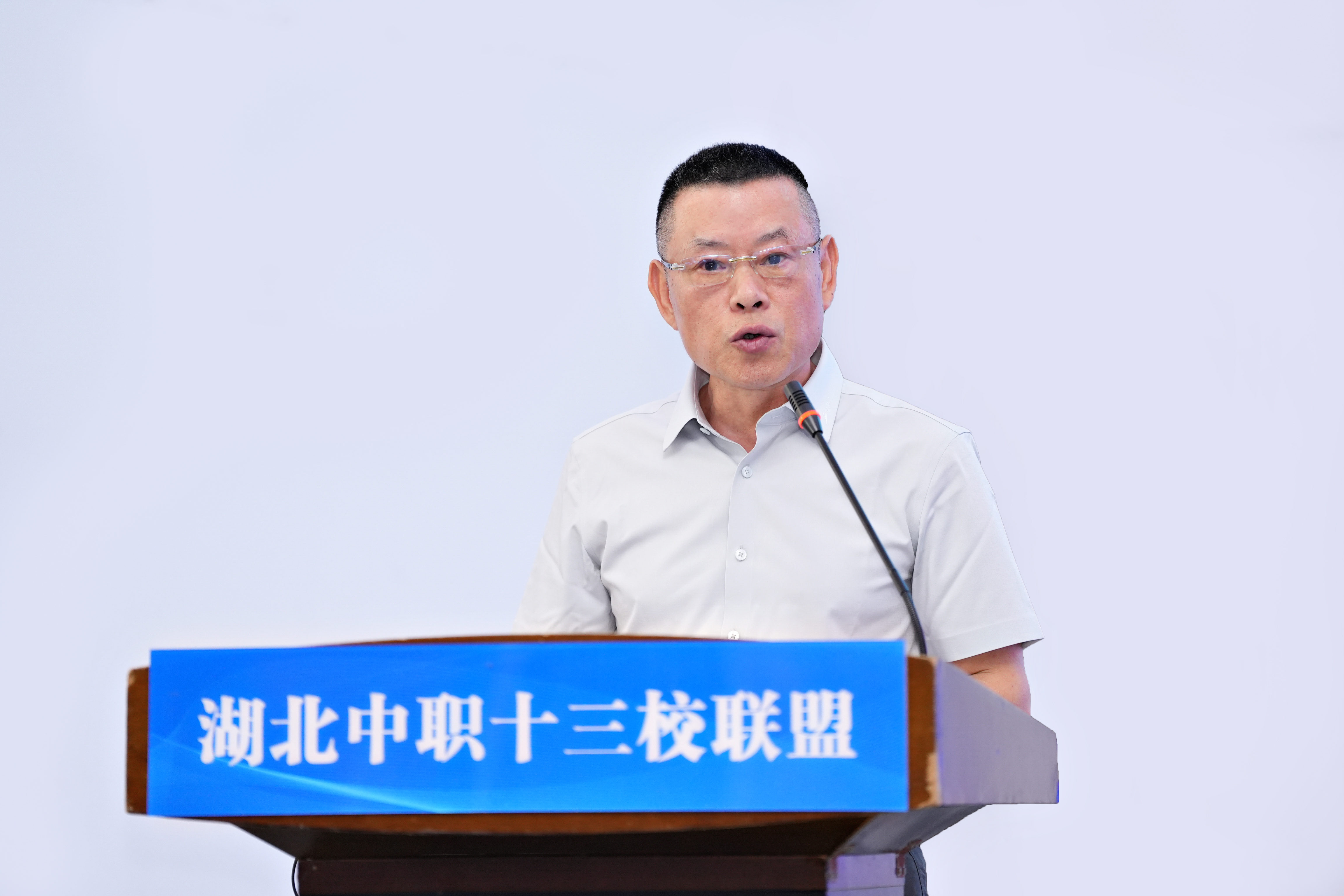 活动伊始,通山县职业教育中心作为联盟的重要成员、本次活动承办方,校长熊唤林发表致辞。熊校长的致辞既展现了通山职教中心作为东道主的担当与风范,又体现了对职业教育发展的深刻洞察。他以“通山情怀”为纽带,以“开放包容”的姿态,欢迎兄弟学校交流合作。熊校长表示,中职教育的开设是国家教育改革的重要举措之一,湖北中职十三校联盟作为湖北职业教育界的重要平台,实现了优质教育资源共享,形成了高效、便捷、科学的教学工作系统,推进了学校之间合作,促进了全省中等职业教育的高质量发展。