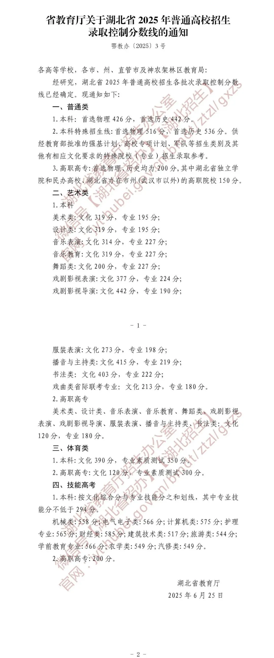 省教育厅关于湖北省2025年普通高校招生录取控制分数线的通知